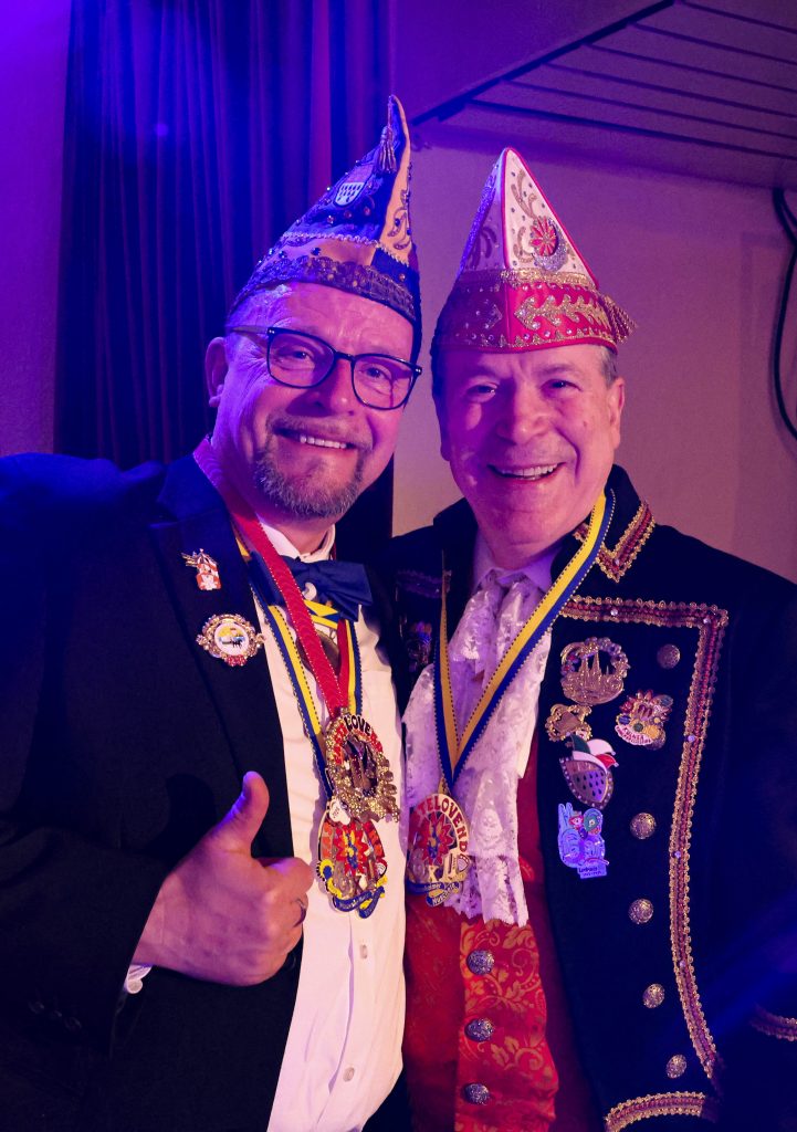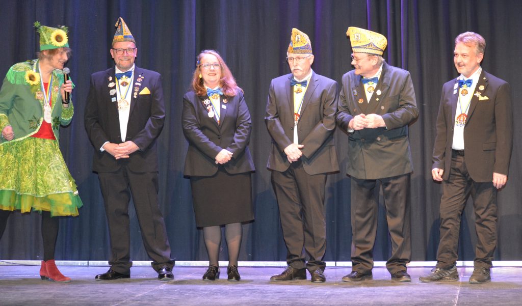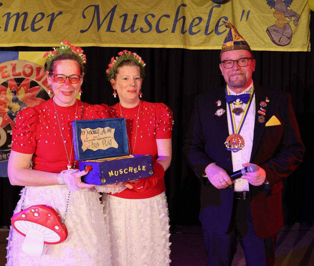 Im Programm gab es eine große Überraschung für uns Muschele und unsere Damen. Vor dem Auftritt von „Scharmöör“ stand völlig unerwartet hoher Besuch vor im Saal. Eine Abordnung des Vorstands des „Festkomitees Kölner Karneval“ hatte Volker Kaiser um Geheimhaltung ihres Kommens gebeten. Sie wollten die Band überraschen, und als passenden Rahmen dafür hatten sie sich unsere Mädchensitzung ausgesucht.