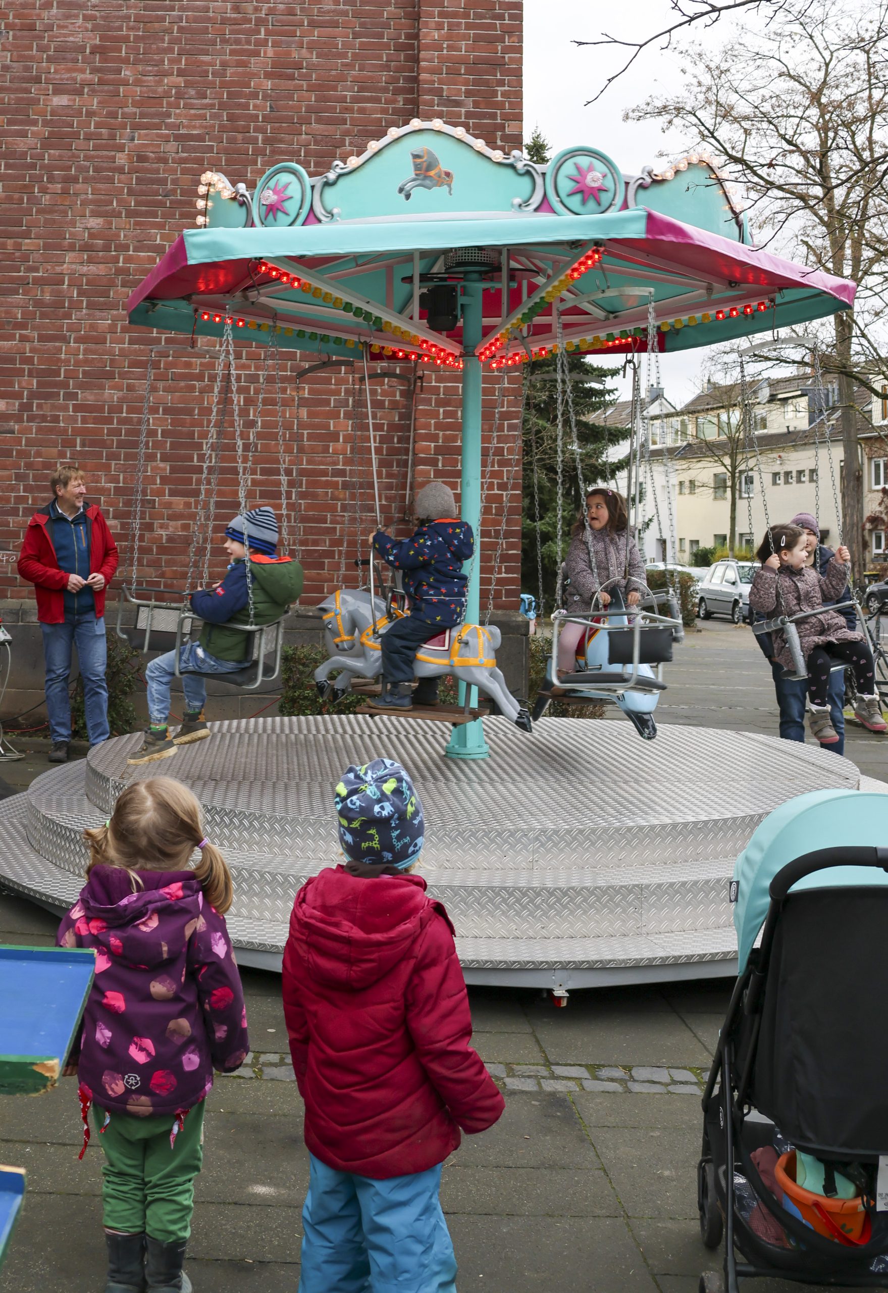 Wie immer standen an diesem Nachmittag die Kinder im Mittelpunkt. Für sie gab es zahlreiche Spielstationen, darunter Nageln, Dosenwerfen, Heißer Draht, Basteln und vieles mehr. Als besondere Attraktion drehte ein Kettenkarussell seine Runden. Damit jedes Kind an allen Spielen teilnehmen konnte, gab es eine Spielekarte für 2,00 Euro. Mit dieser Karte konnten die Kinder an den einzelnen Stationen spielen und sich die Teilnahme abzeichnen lassen. War die Karte voll, durfte sich jedes Kind eine Leckerei aussuchen. Zur Auswahl standen Waffeln, Crêpes, Zuckerwatte oder Kuchen. Natürlich gab es auch herzhafte Speisen wie Pilzpfanne und Reibekuchen.