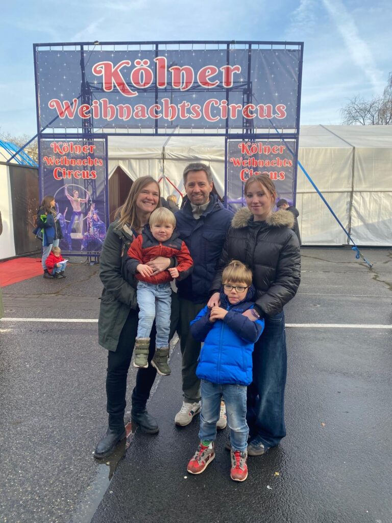 Bei der Tombola gab es viele attraktive Preise zu gewinnen. Der Hauptpreis, vier Karten für den Kölner Weihnachtscircus, wurde um 17.30 Uhr unter allen Gewinnlosen ausgelost. Als Volker Kaiser, der Präsident der Mauenheimer Muschele, in den Los-Eimer griff, war die Spannung groß. Gewonnen hat eine Mauenheimer Familie. Anja und Arne Knab waren mit ihren beiden jüngeren Kindern Juri und Benno auf dem Markt. Alle vier strahlten vor Freude und freuten sich sehr auf den Zirkus, zu dem sie natürlich auch Mia, die Älteste, mitnehmen wollten. Das Los hätte kaum glücklicher gezogen werden können – ein echter Volltreffer! Am 21. Dezember ging es dann zum Weihnachtscircus. Die fünf waren total begeistert und erlebten einen fantastischen Tag. Mit wunderschönen Fotos bedankten sie sich bei den Mauenheimer Muschele.